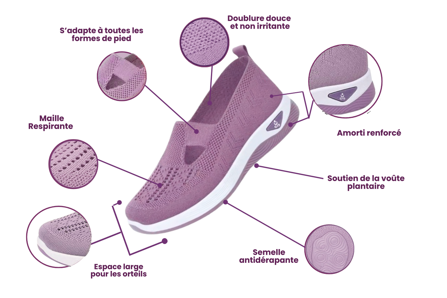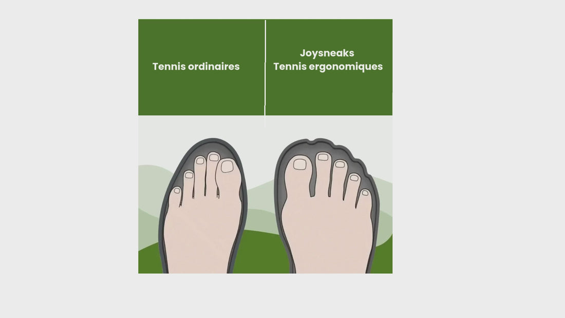 " Grâce à une semelle ergonomique unique, Joysneaks absorbe les chocs et soutient votre voûte plantaire. Fini les douleurs aux pieds, aux genoux, au dos. "